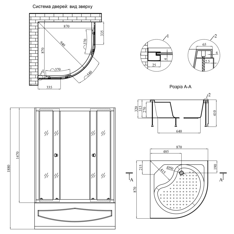 Комплектація: Піддон, сифон, ручки, ролики, профіль, ніжки, комплект кріпильних деталей.