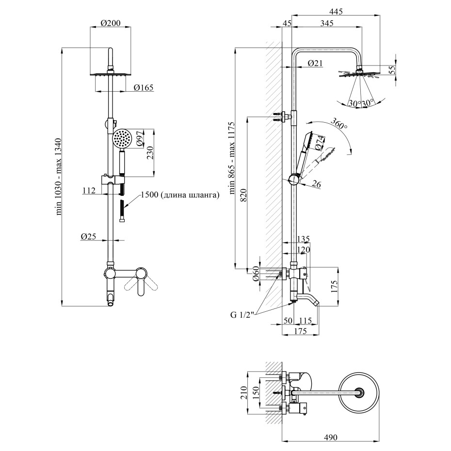 Висота душової стійки, мм: 865-1175