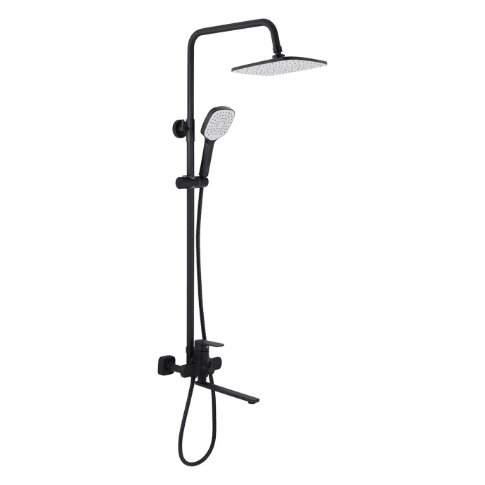 Комплектація: Змішувач, лійка з кронштейном для верхнього душу, лійка з кронштейном для ручного душу, душовий шланг, душова стійка, кріплення, фум стрічка.