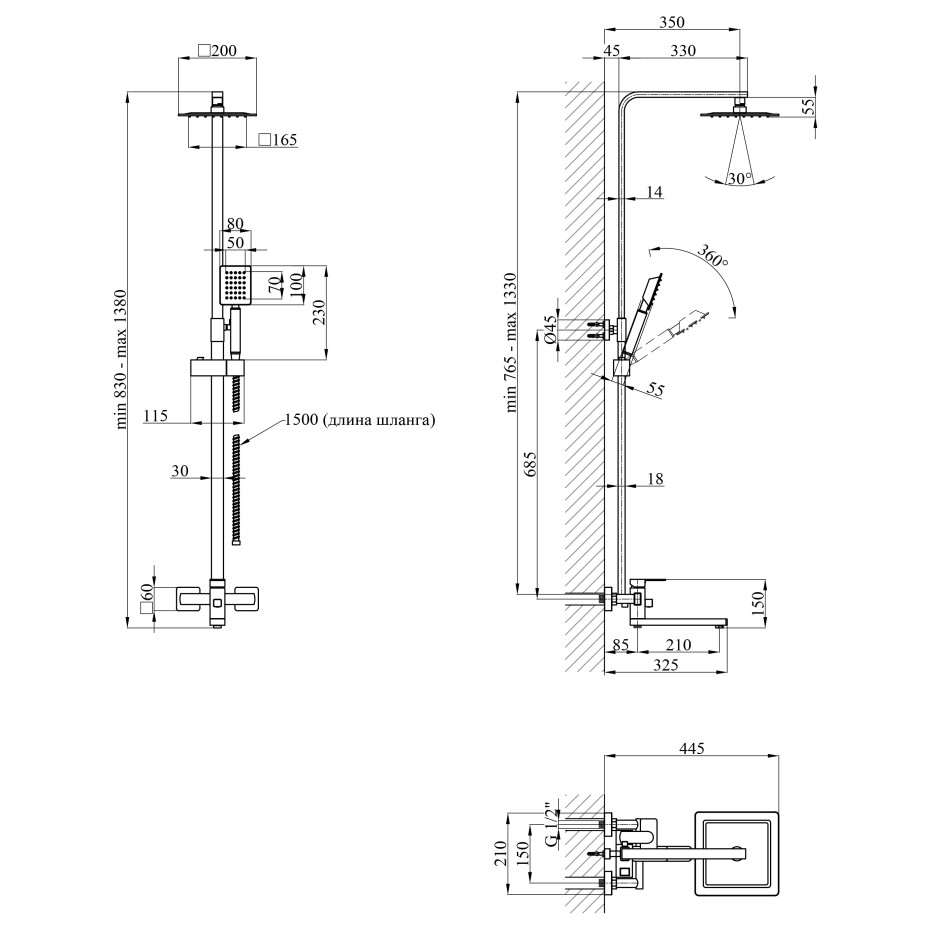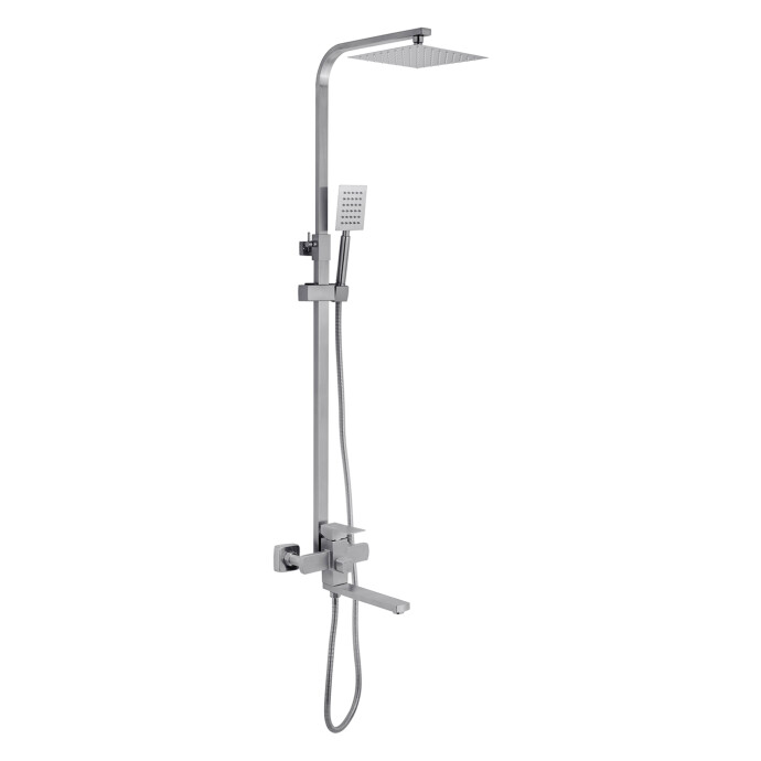 Комплектація: Змішувач, лійка з кронштейном для верхнього душу, лійка з кронштейном для ручного душу, душовий шланг, душова стійка, кріплення.
