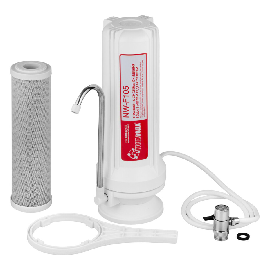 Фільтр Нова Вода NW-F105 — це компактна та ефективна система («водоочисник»), яка встановлюється безпосередньо на кухонну стільницю поруч із мийкою. Вона призначена для комплексного очищення холодної водопровідної води від більшості поширених забруднень. Завдяки використанню двоступеневого картриджа, система не тільки покращує органолептичні властивості води, але і значно знижує її каламутність і вміст шкідливих домішок.