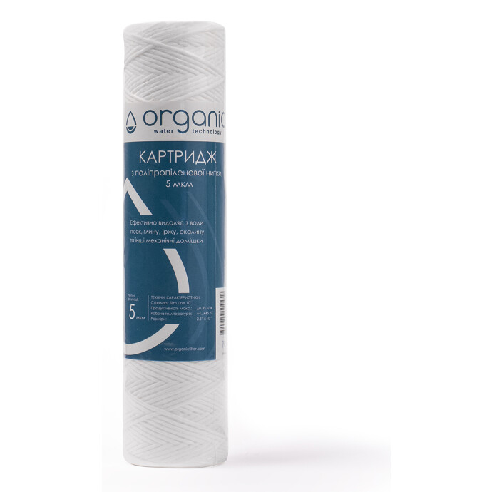 Картридж із поліпропіленової нитки Organic DMSW10PP1 - використовується для очищення води від завислих частинок діаметром до 5 мкм у магістральних фільтрах, які встановлюються на вході у квартиру чи будинок. Даний механічний картридж має щільну структуру намотування поліпропіленового шнура, що дозволяє ефективно затримувати всі механічні домішки, що містяться у водопровідній воді. Термін служби: до 8000 л (4 – 6 місяців).