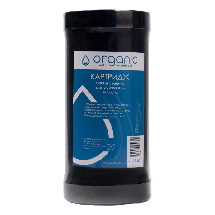 Картридж з активованим гранульованим вугіллям Organic DC10BB підходить для всіх магістральних фільтрів типорозміру Вig Вlue 10. Його застосовують у квартирах та будинках, де вода насичена хлором та органічними домішками. Наповнювачем картриджа служить активоване кокосове вугілля, відоме високим ступенем сорбції. Наявність мікропорів дозволяє ефективніше затримувати забруднення, забезпечуючи хороші показники фільтрації. Пропускна спроможність: до 5 л/хв.
