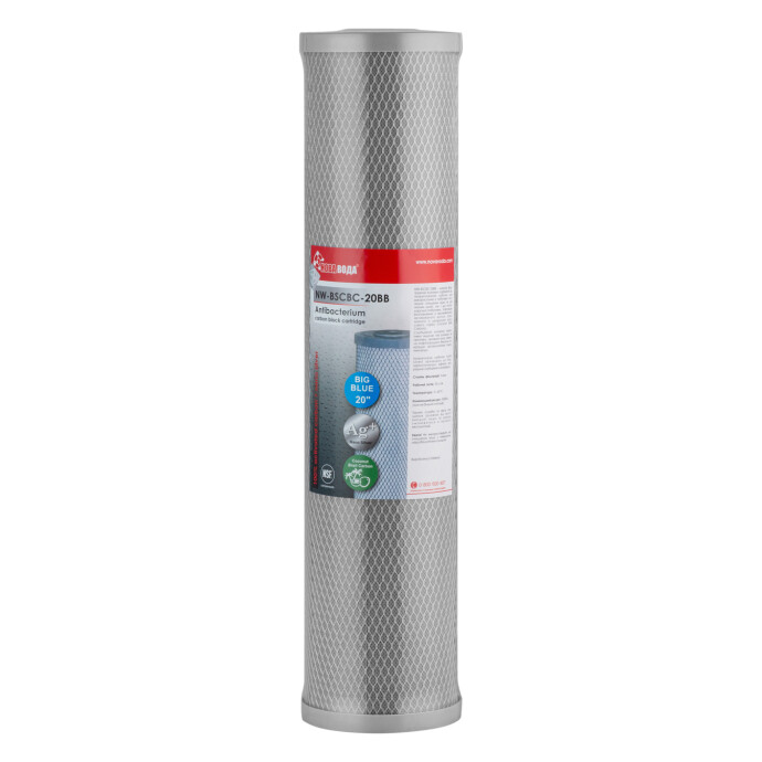 Картридж Нова Вода NW-BSCBC-20BB – це надпотужний елемент магістрального типу, що фільтрує, виготовлений за технологією Carbon Block з високоякісного пресованого кокосового вугілля з додаванням активного срібла. Завдяки максимальному розміру (20 дюймів) та унікальному складу картридж забезпечує високий рівень очищення води при екстремально великих обсягах споживання.