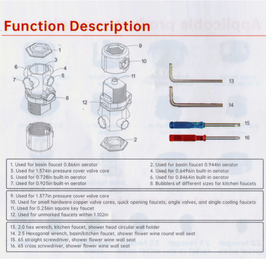 - Універсальність: Ключ забезпечує сумісність із різними розмірами різьблення аераторів, що робить його ідеальним вибором для широкого спектра моделей змішувачів.