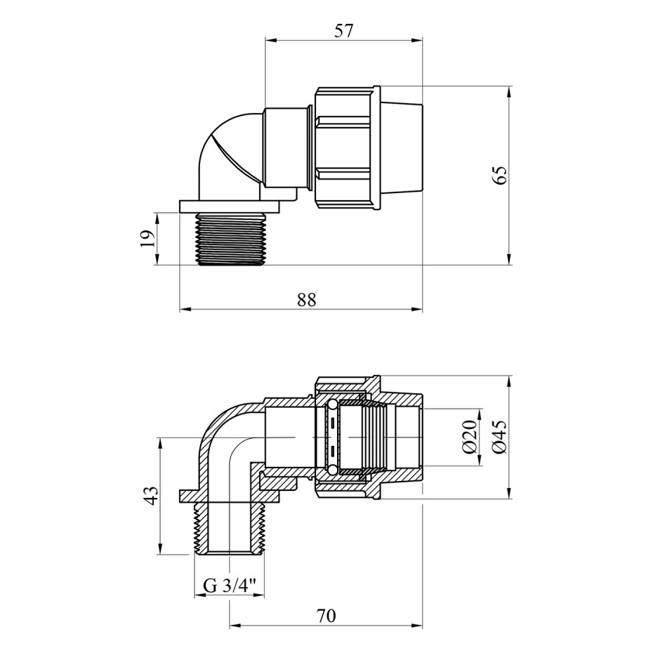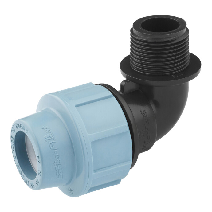 Коліно ПЕ SantehPlast 20х3/4" РЗ — це компресійний фітинг, призначений для з'єднання поліетиленових труб під кутом 90 градусів з можливістю підключення до різьбового з'єднання. Він використовується при монтажі систем водопостачання, каналізації та інших трубопровідних систем.