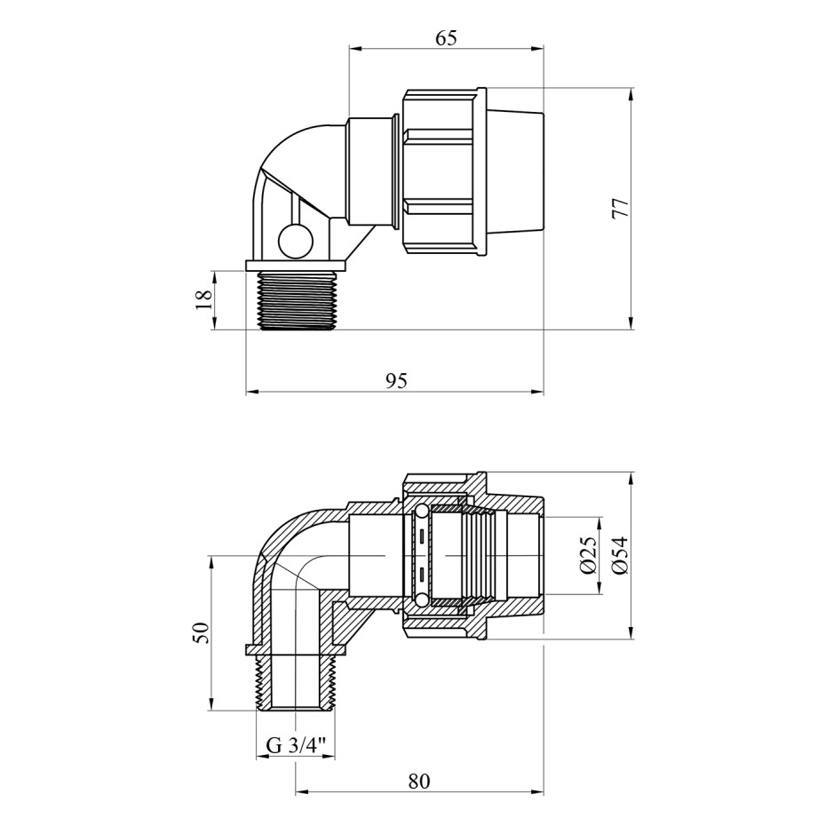 Коліно ПЕ SantehPlast 25х3/4" РЗ — це компресійний фітинг, призначений для з'єднання поліетиленових труб під кутом 90 градусів з можливістю підключення до різьбового з'єднання. Він використовується при монтажі систем водопостачання, каналізації та інших трубопровідних систем.