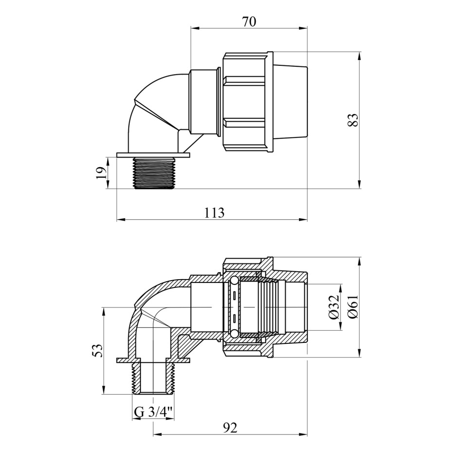 Коліно ПЕ SantehPlast 32х3/4" РЗ — це компресійний фітинг, призначений для з'єднання поліетиленових труб під кутом 90 градусів з можливістю підключення до різьбового з'єднання. Він використовується при монтажі систем водопостачання, каналізації та інших трубопровідних систем.