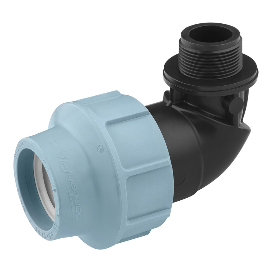 Коліно ПЕ SantehPlast 50х1 1/4" РЗ — це компресійний фітинг, призначений для з'єднання поліетиленових труб під кутом 90 градусів з можливістю підключення до різьбового з'єднання. Він використовується при монтажі систем водопостачання, каналізації та інших трубопровідних систем.