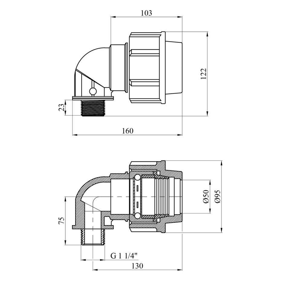 Коліно ПЕ SantehPlast 50х1 1/4" РЗ — це надійний і простий у монтажі фітинг, що забезпечує герметичне з'єднання поліетиленових труб з можливістю під'єднання до різьбового з'єднання. Він ідеально підходить для використання в різних системах водопостачання та каналізації.