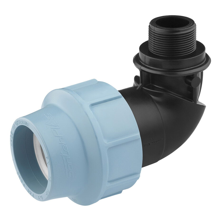 Коліно ПЕ SantehPlast 63х1 1/2" РЗ — це компресійний фітинг, призначений для з'єднання поліетиленових труб під кутом 90 градусів з можливістю підключення до різьбового з'єднання. Він використовується при монтажі систем водопостачання, каналізації та інших трубопровідних систем.