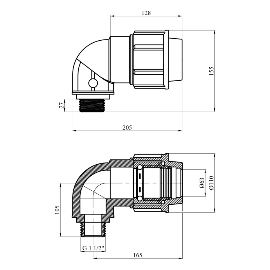 Коліно ПЕ SantehPlast 63х1 1/2" РЗ — це надійний і простий у монтажі фітинг, що забезпечує герметичне з'єднання поліетиленових труб з можливістю під'єднання до різьбового з'єднання. Він ідеально підходить для використання в різних системах водопостачання та каналізації.