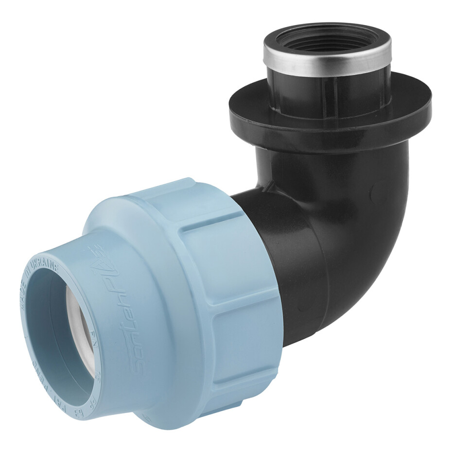 Коліно ПЕ SantehPlast 63х1 1/2" РВ — це компресійний фітинг, призначений для з'єднання поліетиленових труб під кутом 90 градусів з можливістю підключення до різьбового з'єднання. Він використовується при монтажі систем водопостачання, каналізації та інших трубопровідних систем.