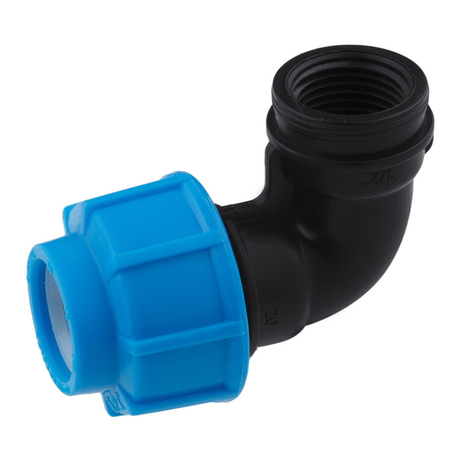Коліно ПЕ SPT 20х1/2" РВ — це комбінований компресійний (обтискний) фітинг, призначений для з'єднання поліетиленових (ПЕ) труб з різьбовими елементами. Воно дає змогу змінювати напрямок трубопроводу на 90 градусів і одночасно під'єднувати пристрої або труби із зовнішнім різьбленням.