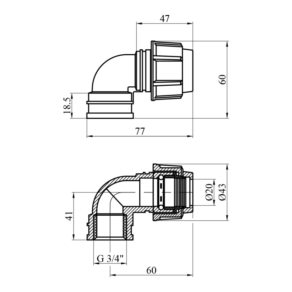 Коліно ПЕ SPT 20х3/4" РВ — це комбінований компресійний (обтискний) фітинг, призначений для з'єднання поліетиленових (ПЕ) труб з різьбовими елементами. Воно дає змогу змінювати напрямок трубопроводу на 90 градусів і одночасно під'єднувати пристрої або труби із зовнішнім різьбленням.