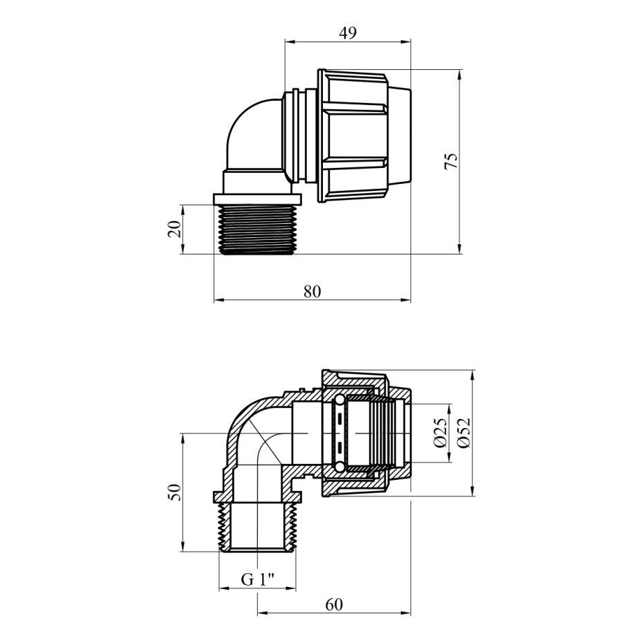 Коліно ПЕ SPT 25х1" РЗ — це комбінований компресійний (обтискний) фітинг, призначений для з'єднання поліетиленових (ПЕ) труб з різьбовими елементами. Воно дає змогу змінювати напрямок трубопроводу на 90 градусів і водночас під'єднувати пристрої або труби з внутрішнім різьбленням.
