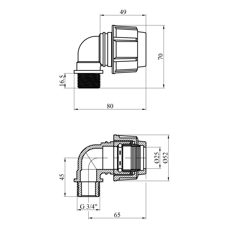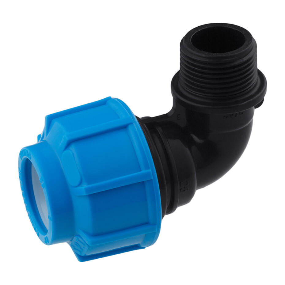 Коліно ПЕ SPT 25х3/4" РЗ — це комбінований компресійний (обтискний) фітинг, призначений для з'єднання поліетиленових (ПЕ) труб з різьбовими елементами. Воно дає змогу змінювати напрямок трубопроводу на 90 градусів і водночас під'єднувати пристрої або труби з внутрішнім різьбленням.