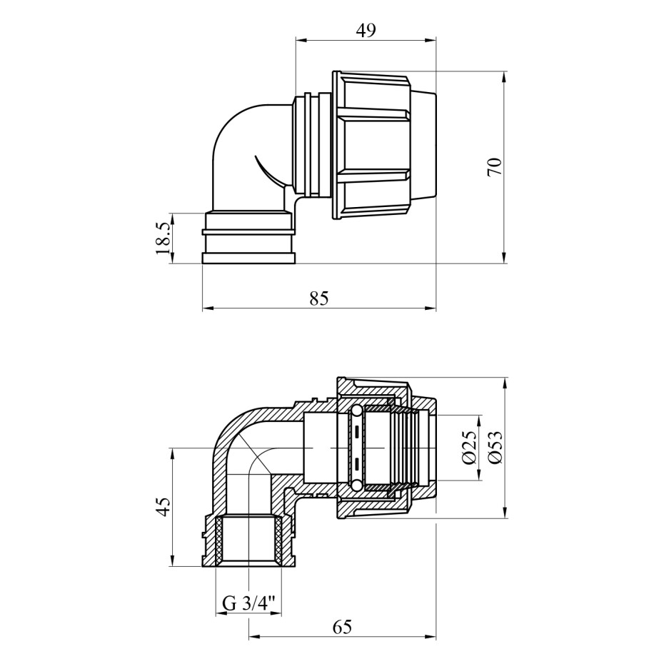 Коліно ПЕ SPT 25х3/4" РВ — це комбінований компресійний (обтискний) фітинг, призначений для з'єднання поліетиленових (ПЕ) труб з різьбовими елементами. Воно дає змогу змінювати напрямок трубопроводу на 90 градусів і одночасно під'єднувати пристрої або труби із зовнішнім різьбленням.
