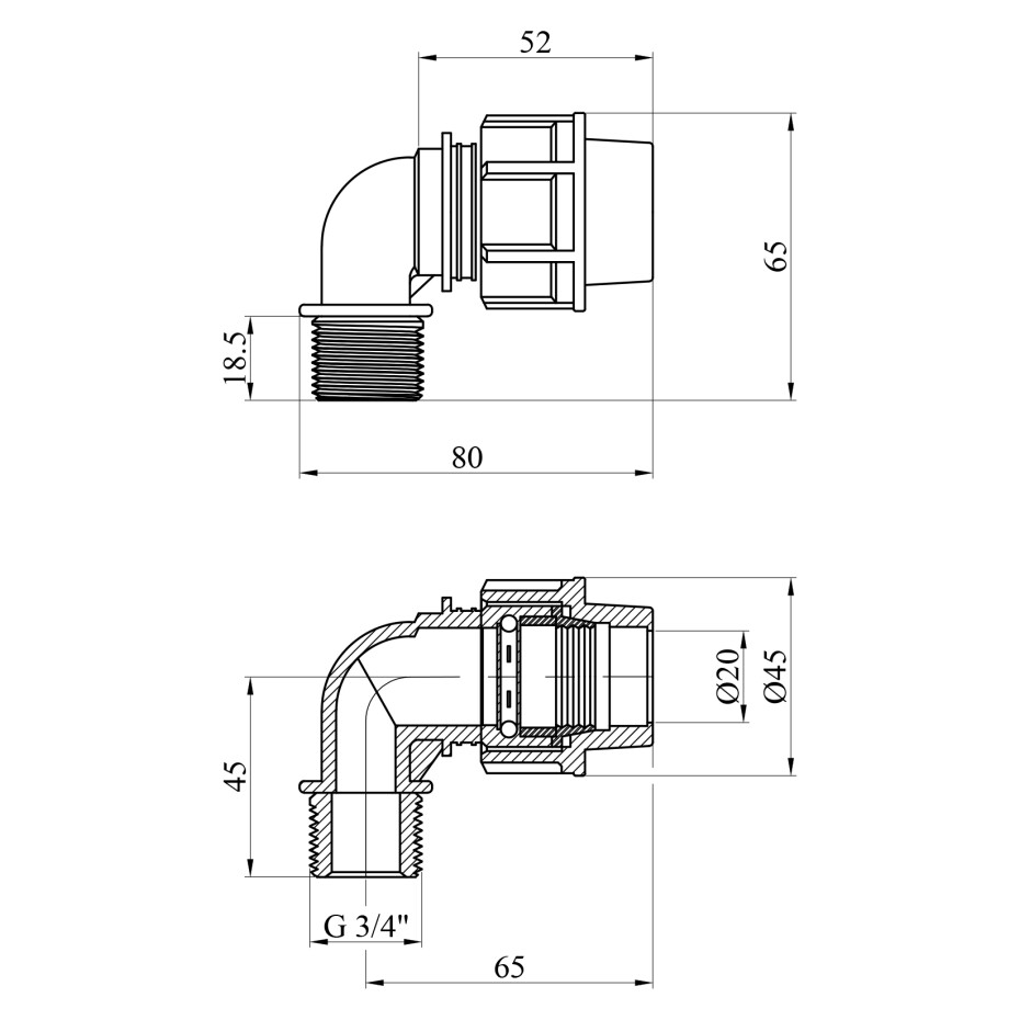 Коліно ПЕ STR 20х3/4" РЗ — це комбінований компресійний (обтискний) фітинг, призначений для з'єднання поліетиленових (ПЕ) труб з різьбовими елементами. Воно дає змогу змінювати напрямок трубопроводу на 90 градусів і водночас під'єднувати пристрої або труби з внутрішнім різьбленням.