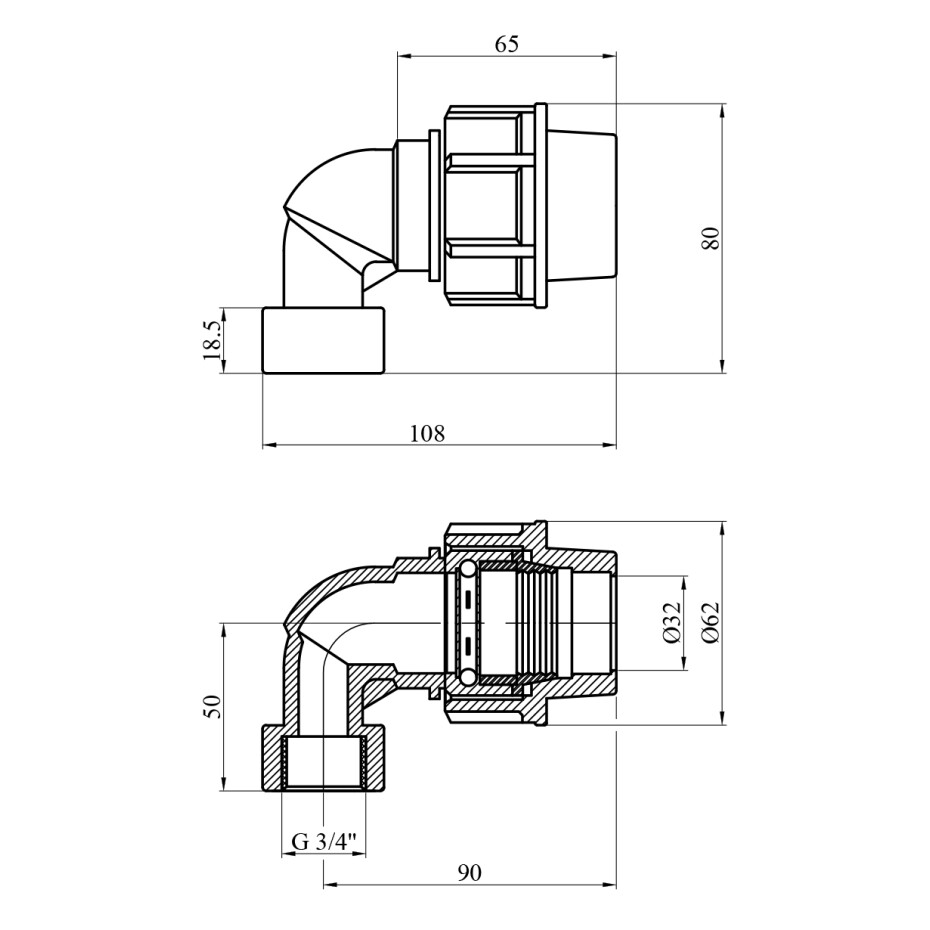 Коліно ПЕ STR 32х3/4" РВ — це комбінований компресійний (обтискний) фітинг, призначений для з'єднання поліетиленових (ПЕ) труб з різьбовими елементами. Воно дає змогу змінювати напрямок трубопроводу на 90 градусів і одночасно під'єднувати пристрої або труби із зовнішнім різьбленням.