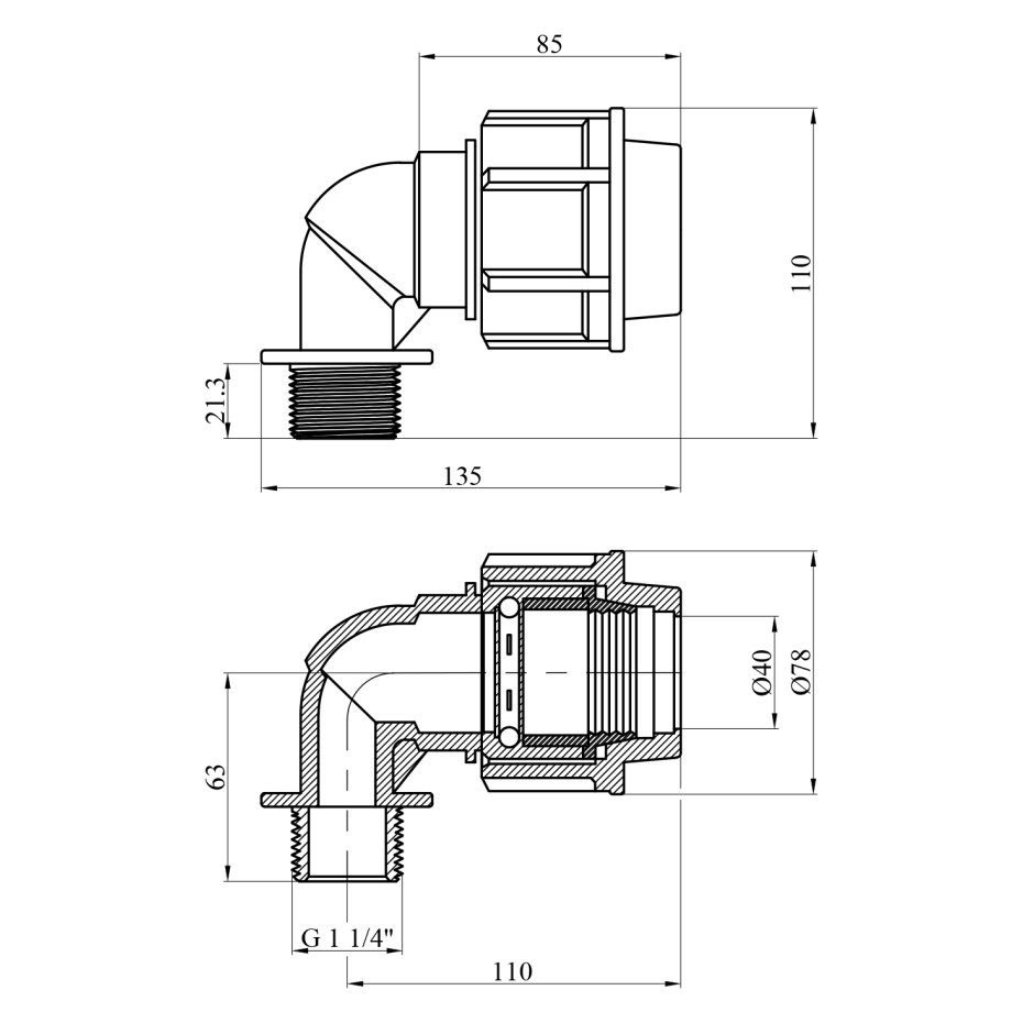 Коліно ПЕ STR 40х1 1/4" РЗ — це комбінований компресійний (обтискний) фітинг, призначений для з'єднання поліетиленових (ПЕ) труб з різьбовими елементами. Воно дає змогу змінювати напрямок трубопроводу на 90 градусів і водночас під'єднувати пристрої або труби з внутрішнім різьбленням.