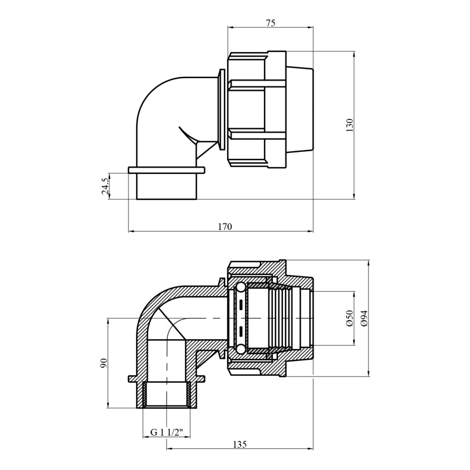 Коліно ПЕ STR 50х1 1/2" РВ — це комбінований компресійний (обтискний) фітинг, призначений для з'єднання поліетиленових (ПЕ) труб з різьбовими елементами. Воно дає змогу змінювати напрямок трубопроводу на 90 градусів і одночасно під'єднувати пристрої або труби із зовнішнім різьбленням.