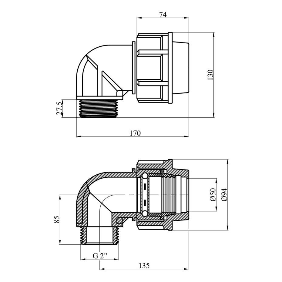 Коліно ПЕ STR 50х2" РЗ — це комбінований компресійний (обтискний) фітинг, призначений для з'єднання поліетиленових (ПЕ) труб з різьбовими елементами. Воно дає змогу змінювати напрямок трубопроводу на 90 градусів і водночас під'єднувати пристрої або труби з внутрішнім різьбленням.