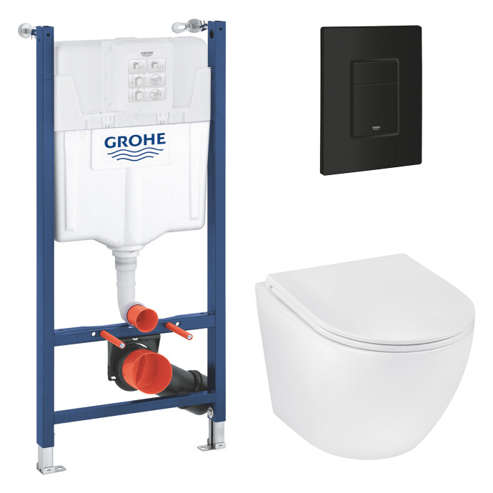 Комплект 4 в 1: Інсталяція Grohe Solido 2 в 1 38971000 + Панель змиву для унітазу Grohe Even 389662430 + Унітаз підвісний безободковий Kroner Harz WHI493736 RIMLESS з сидінням Slim Duroplast /Soft