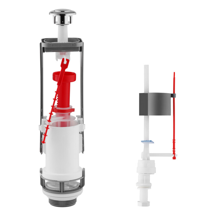 Комплект арматури NM - це надійне і функціональне рішення для оснащення зливного бачка унітазу. Він включає заливний механізм з нижнім підключенням і однорівневий зливний клапан з кнопкою, що забезпечує стабільну подачу води і ефективний змив.