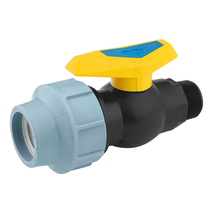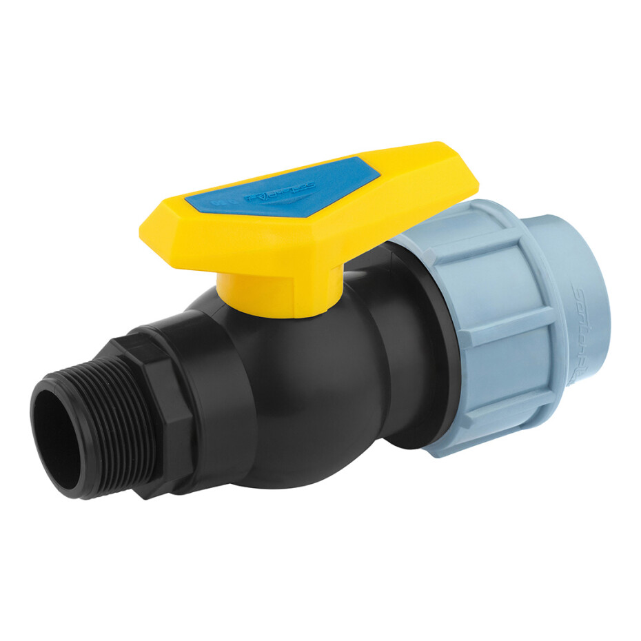 Кран ПЕ SantehPlast 50х1 1/2" РЗ - це кульовий кран з комбінованим з'єднанням: компресійним (50 мм) і різьбовим (1 1/2" зовнішнє різьблення, РЗ). Використовується в системах водопостачання, поливу та технічних трубопроводах, забезпечуючи надійне та герметичне з'єднання.