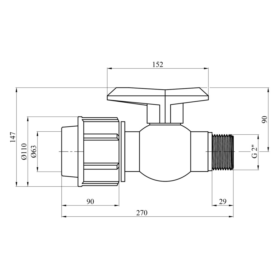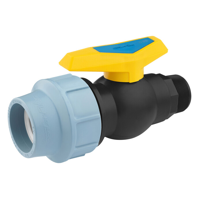 Кран ПЕ SantehPlast 63х2" РЗ - це кульовий кран з комбінованим з'єднанням: компресійним (63 мм) і різьбовим (2" зовнішнє різьблення, РЗ). Використовується в системах водопостачання, поливу та технічних трубопроводах, забезпечуючи надійне та герметичне з'єднання.