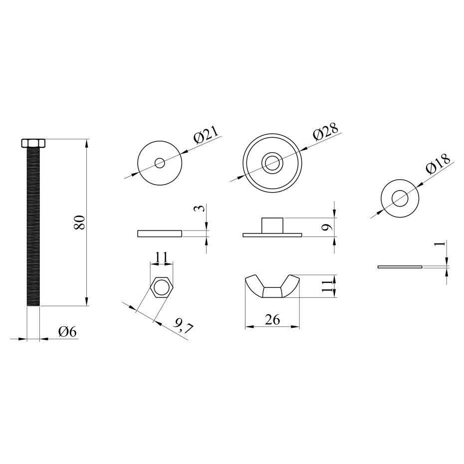 Кріпильні болти та притискні елементи виготовлені з нержавіючої сталі, що забезпечує стійкість до корозії та тривалий термін служби. У комплект також входять ущільнювачі, а замість стандартних пластикових шайб використовуються круглі притискні елементи (кружки) з нержавіючої сталі, які рівномірно розподіляють навантаження і підвищують надійність з'єднання.