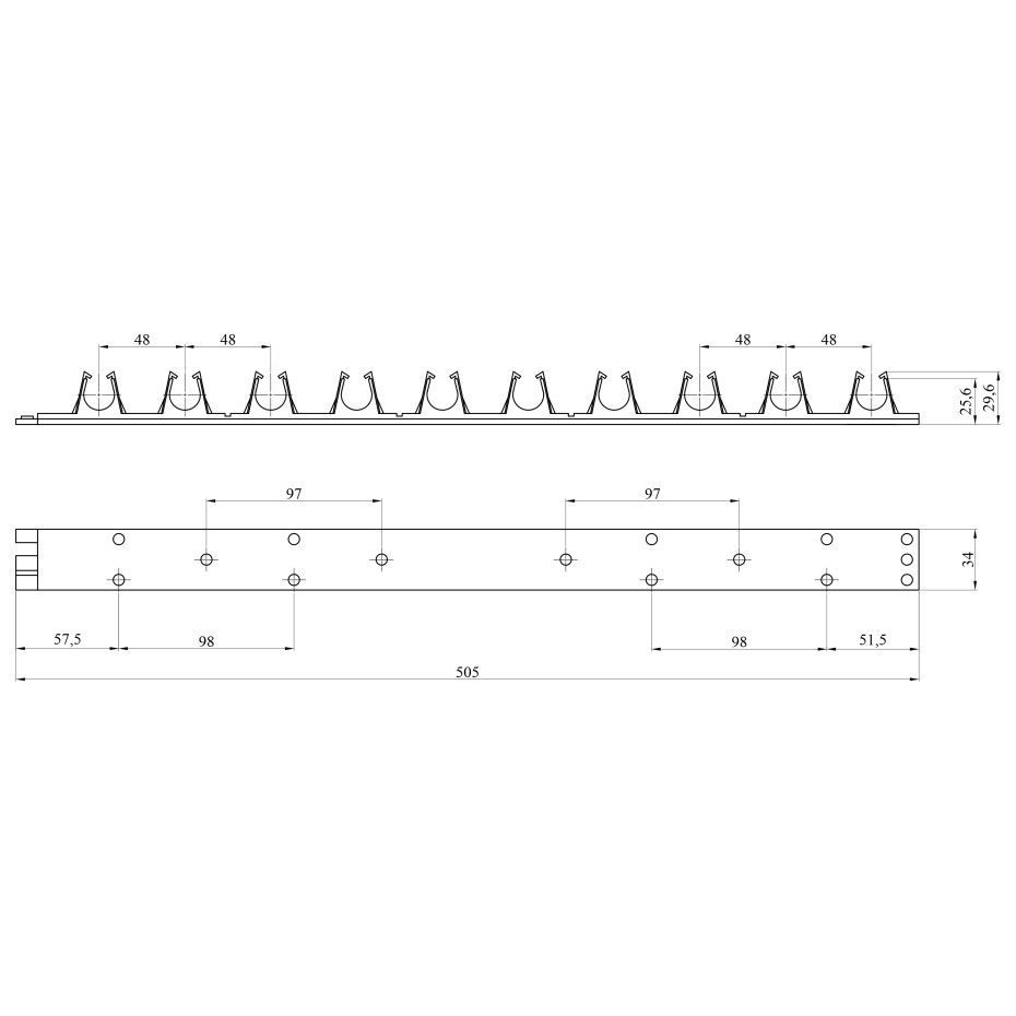 Особливості: має спеціальні фіксатори (скоби) для швидкої та надійної фіксації труби, а також має з'єднувальні елементи для з'єднання з іншими планками.