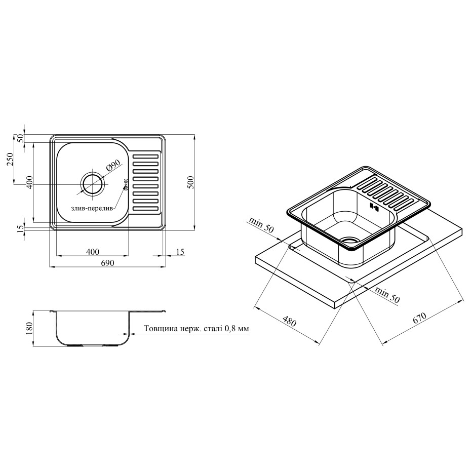 Опис до товару: Кухонна мийка Kroner KRP Satin - 6950 (0.8 мм)