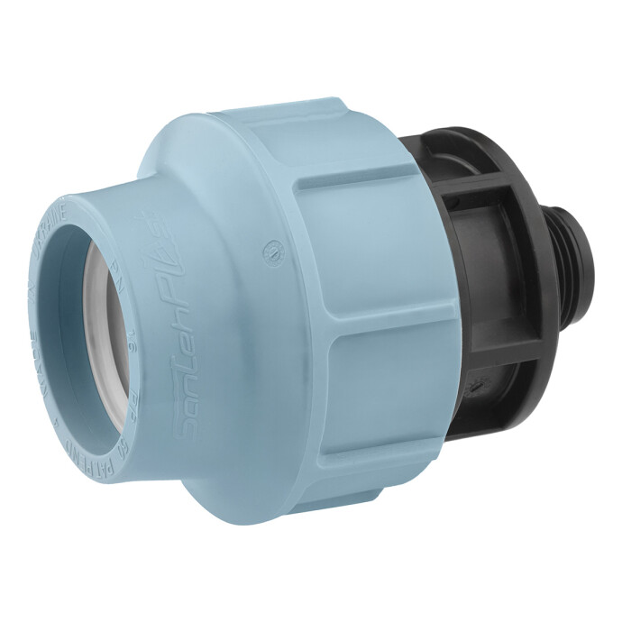 Муфта ПЕ SantehPlast 50x1" РЗ — це з'єднувальний фітинг для поліетиленових труб, що дає змогу надійно з'єднати труби з різними діаметрами. Один кінець розрахований на труби діаметром 50 мм, а інший — на труби з дюймовим з'єднанням 1", виконаним із зовнішнім різьбленням (РЗ).