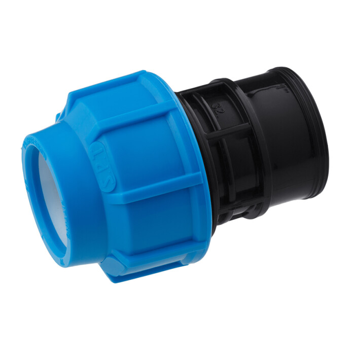 Муфта ПЕ SPT 32х1" РВ — це комбінований компресійний (обтискний) фітинг, призначений для з'єднання поліетиленової (ПЕ) труби з елементом, що має зовнішнє різьблення. Вона дає змогу легко і надійно під'єднати обладнання або інший фітинг до ПЕ труби без зварювання.