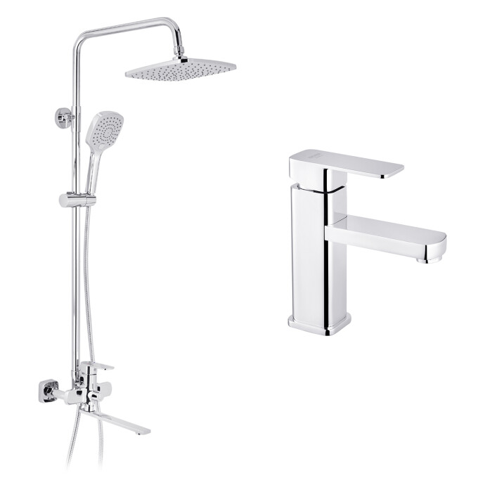 Комплектація: Змішувач, лійка з кронштейном для верхнього душу, лійка з кронштейном для ручного душу, душовий шланг, душова стійка, кріплення, фум стрічка. \ Змішувач, гнучка підводка, кріплення, інструкція.