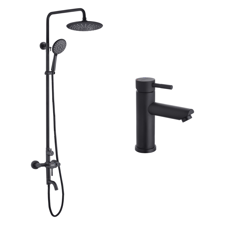 Комплектація: Змішувач, гнучка підводка, кріплення, інструкція. \ Змішувач, лійка з кронштейном для верхнього душу, лійка з кронштейном для ручного душу, душовий шланг, душова стійка, кріплення, фум стрічка.
