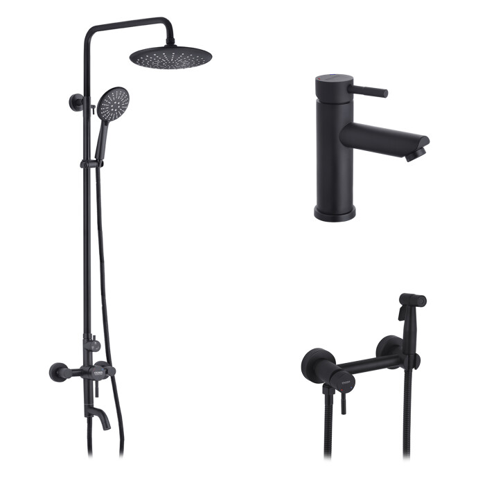 Комплектація: Змішувач, гнучка підводка, кріплення, інструкція. \ Змішувач, лійка з кронштейном для верхнього душу, лійка з кронштейном для ручного душу, душовий шланг, душова стійка, кріплення, фум стрічка. \ Змішувач, шланг для душу, лійка для гігієнічного душу, кріплення, інструкція.