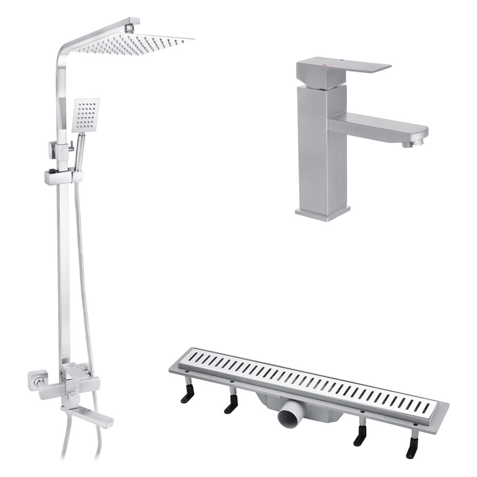 Опис до товару: Набор 3 в 1 душова система Kroner Edelstahl Kubus-ESG063 + змішувач Edelstahl Kubus-ESG010 + трап лінійний Harz S60 Sektion