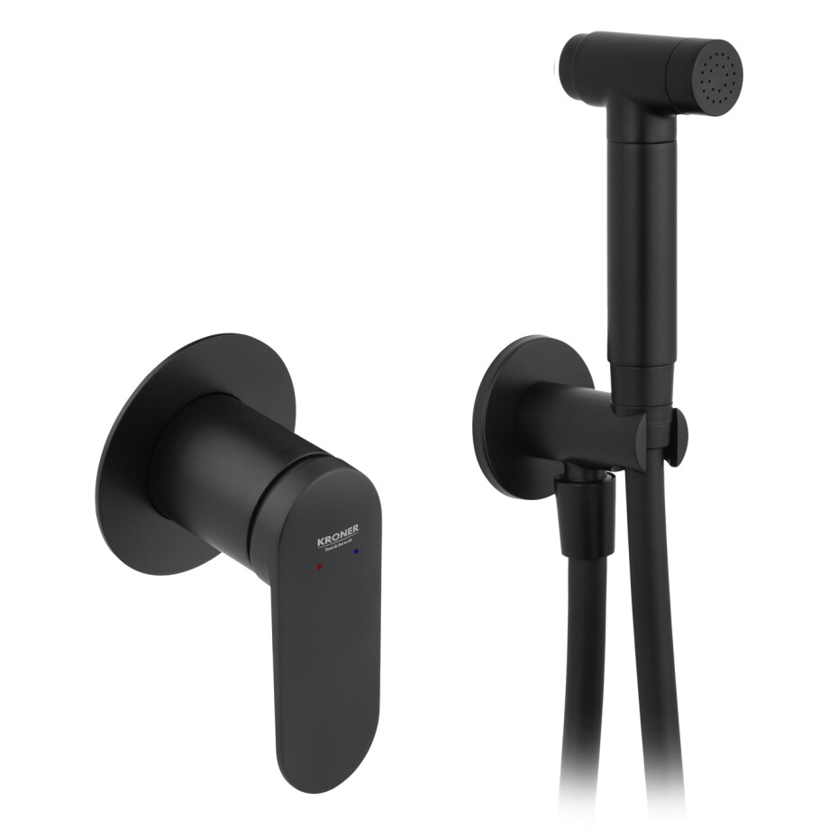 Набір для гігієнічного душу зі змішувачем прихованого монтажу Kroner Element 211234-3801 (чорний) — сучасне і практичне рішення для ванної кімнати, виконане в стильному чорному кольорі з матовим покриттям. Таке виконання підкреслює актуальний дизайн інтер'єру та ідеально підходить для просторів у стилі мінімалізм, лофт або модерн.