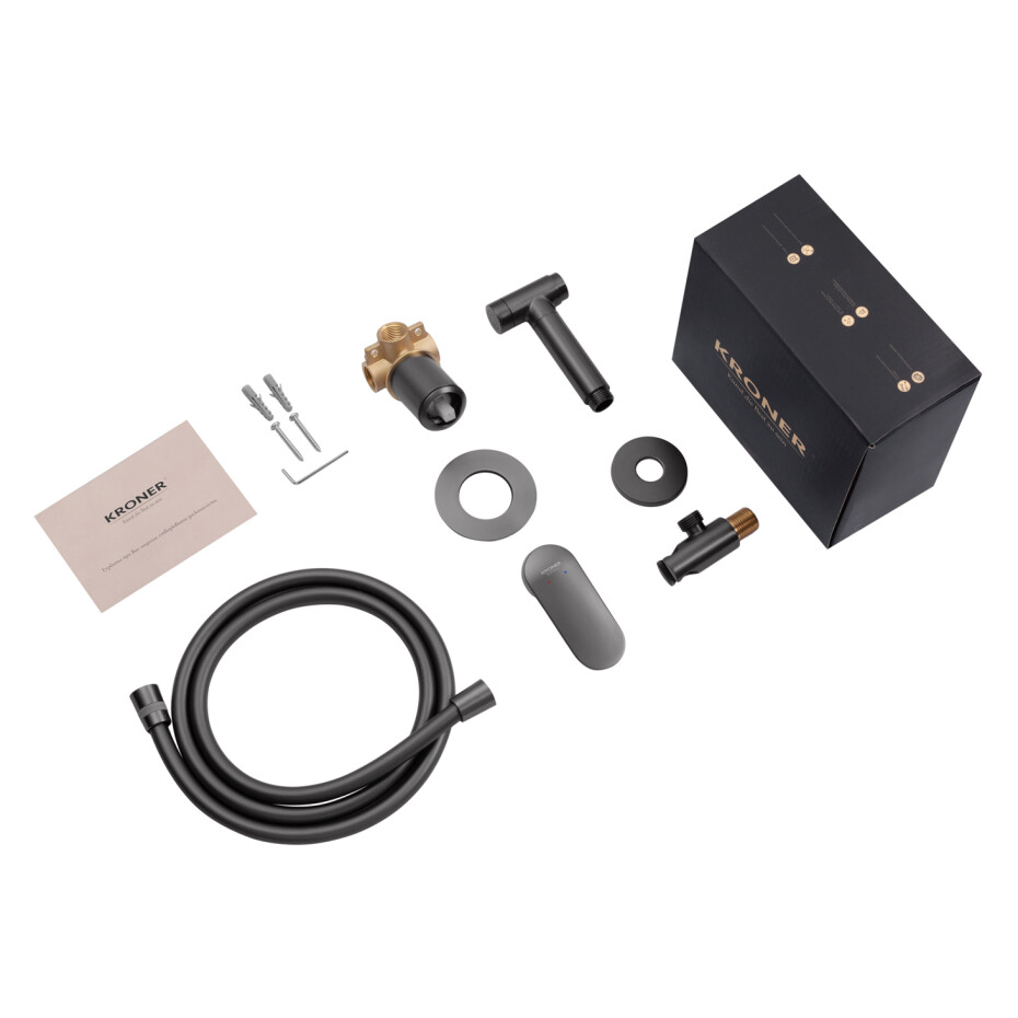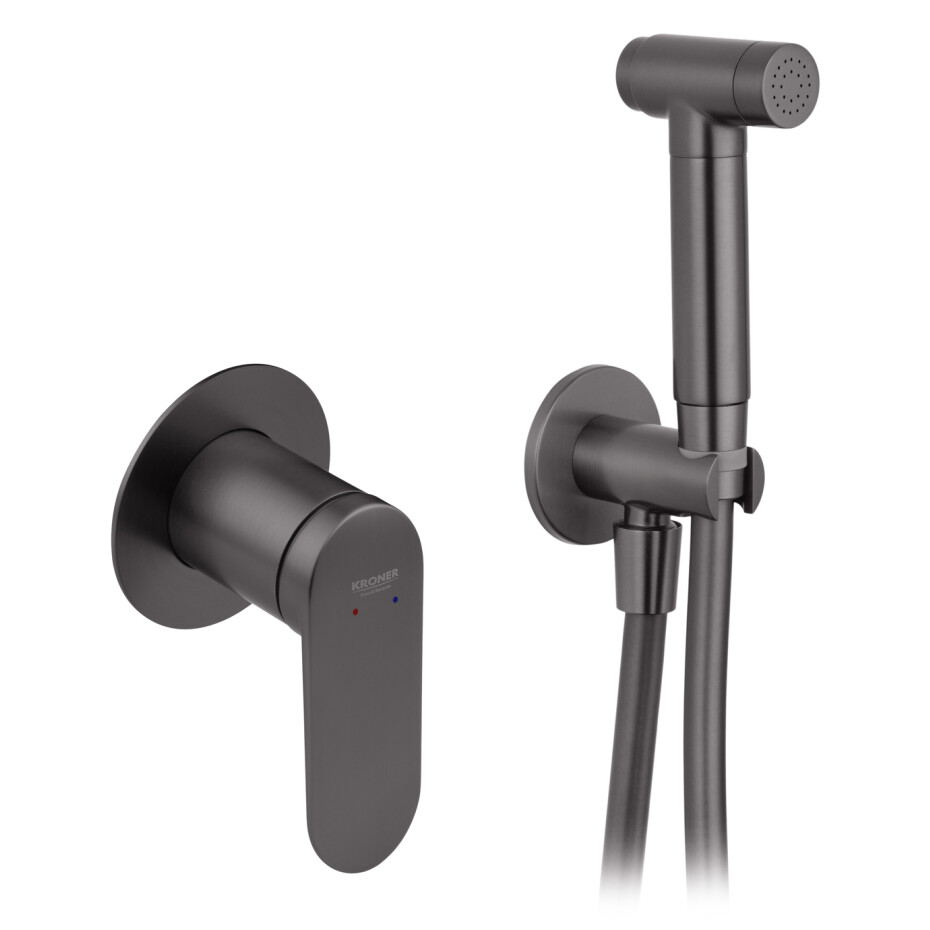 Набір для гігієнічного душу зі змішувачем прихованого монтажу Kroner Element 211234-5301 (графіт) — сучасне і практичне рішення для ванної кімнати, виконане в стильному графітовому кольорі з матовим покриттям. Таке виконання підкреслює актуальний дизайн інтер'єру та ідеально підходить для просторів у стилі мінімалізм, лофт або модерн.