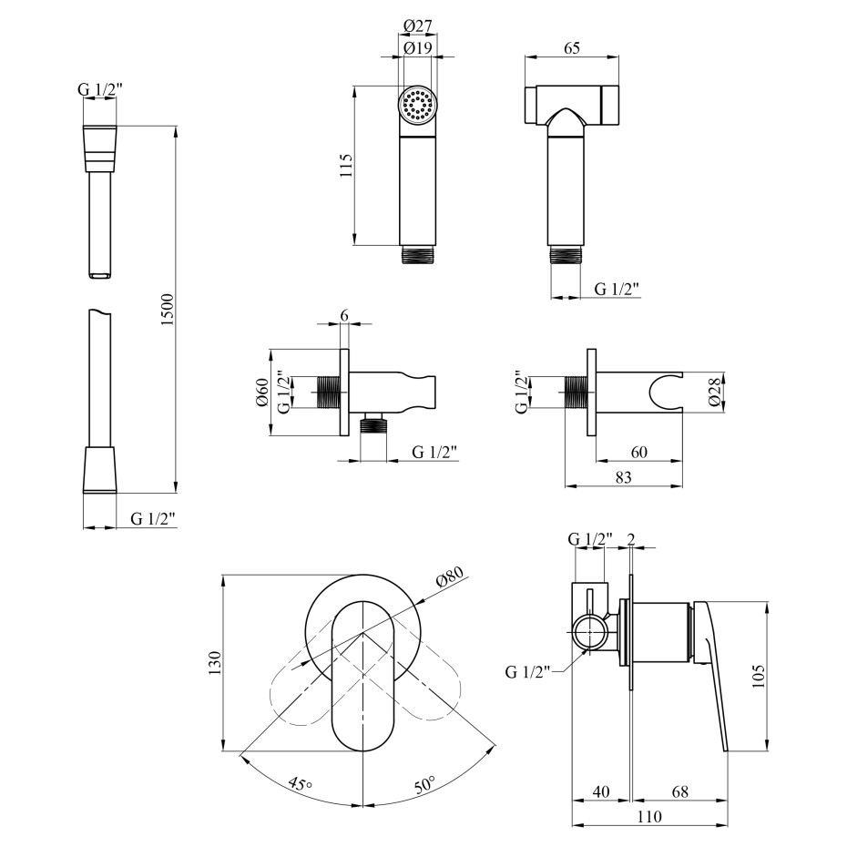 Комплектація: Змішувач прихованого монтажу, кріплення, душовий шланг, кронштейн, лійка для біде, інструкція