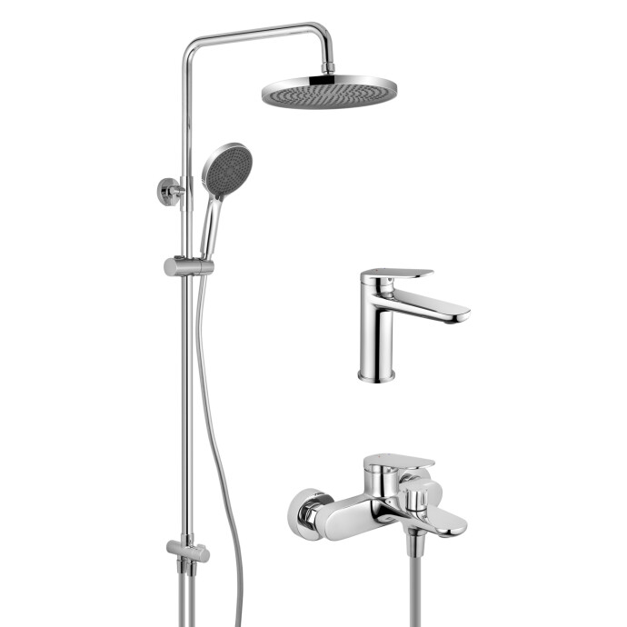 Комплект постачання: Змішувач для раковини, змішувач для ванни, душова система.