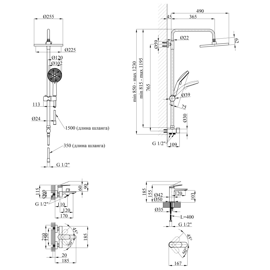 Комплектація: Змішувач, стійка, кронштейн для верхнього душу, лійка для верхнього душу, кронштейн для ручного душу, лійка для ручного душу, шланг, кріплення.