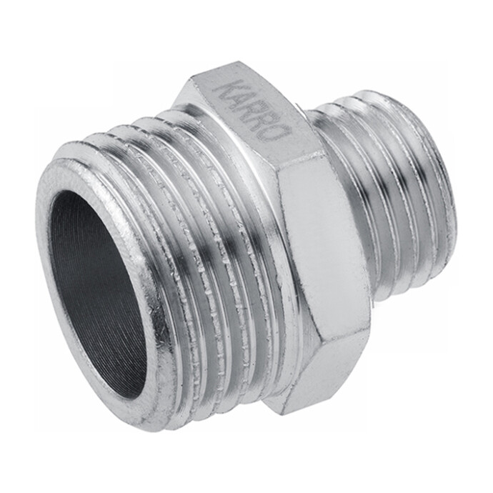 Ніпель перехідний Karro 1 1/2"х3/4" ЗЗ нікельований KR-3114 - компактний перехідник із зовнішнім різьбленням для стикування елементів з різними типорозмірами різьблення.