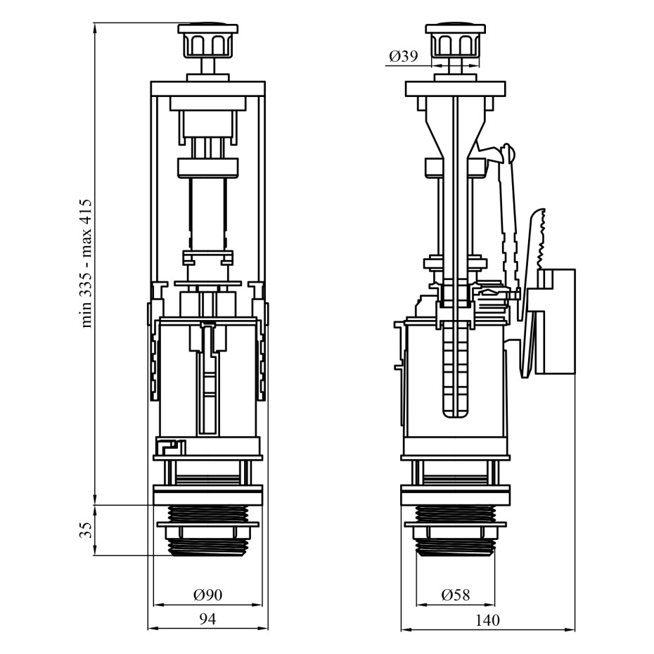 1. Регульована висота установки: Механізм адаптується під бачки різної висоти — від 335 до 415 мм. Підходить для більшості класичних моделей унітазів.