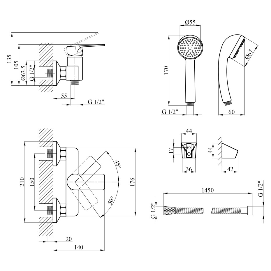 Модель укомплектована всім необхідним для комфортного приймання душу: круглою лійкою з одним режимом струменя, гнучким шлангом довжиною 1450 мм та кронштейном для фіксації ручного душу. Настінний монтаж на ексцентриках гарантує легке встановлення та стабільність конструкції. Змішувач розрахований на роботу при тиску до 3 бар і витраті води до 13 літрів на хвилину, що робить його економним та практичним у щоденному використанні.