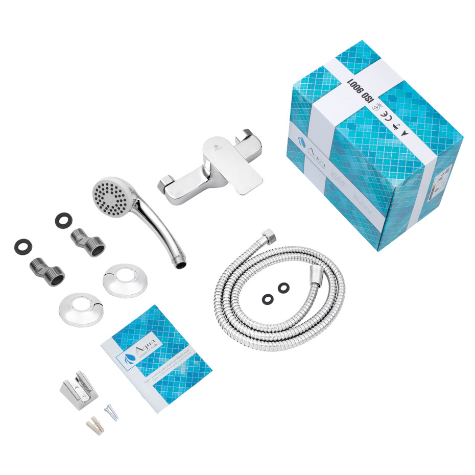Комплектація: Змішувач, лійка для ручного душу, душовий шланг, кронштейн для ручного душу, кріплення, інструкція.