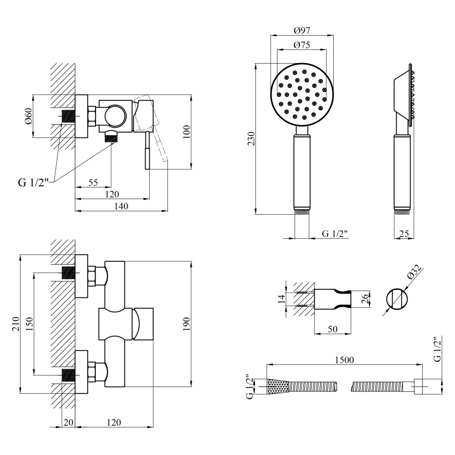 Комплектація: Змішувач, лійка для ручного душу, душовий шланг, кронштейн для ручного душу, кріплення, інструкція.